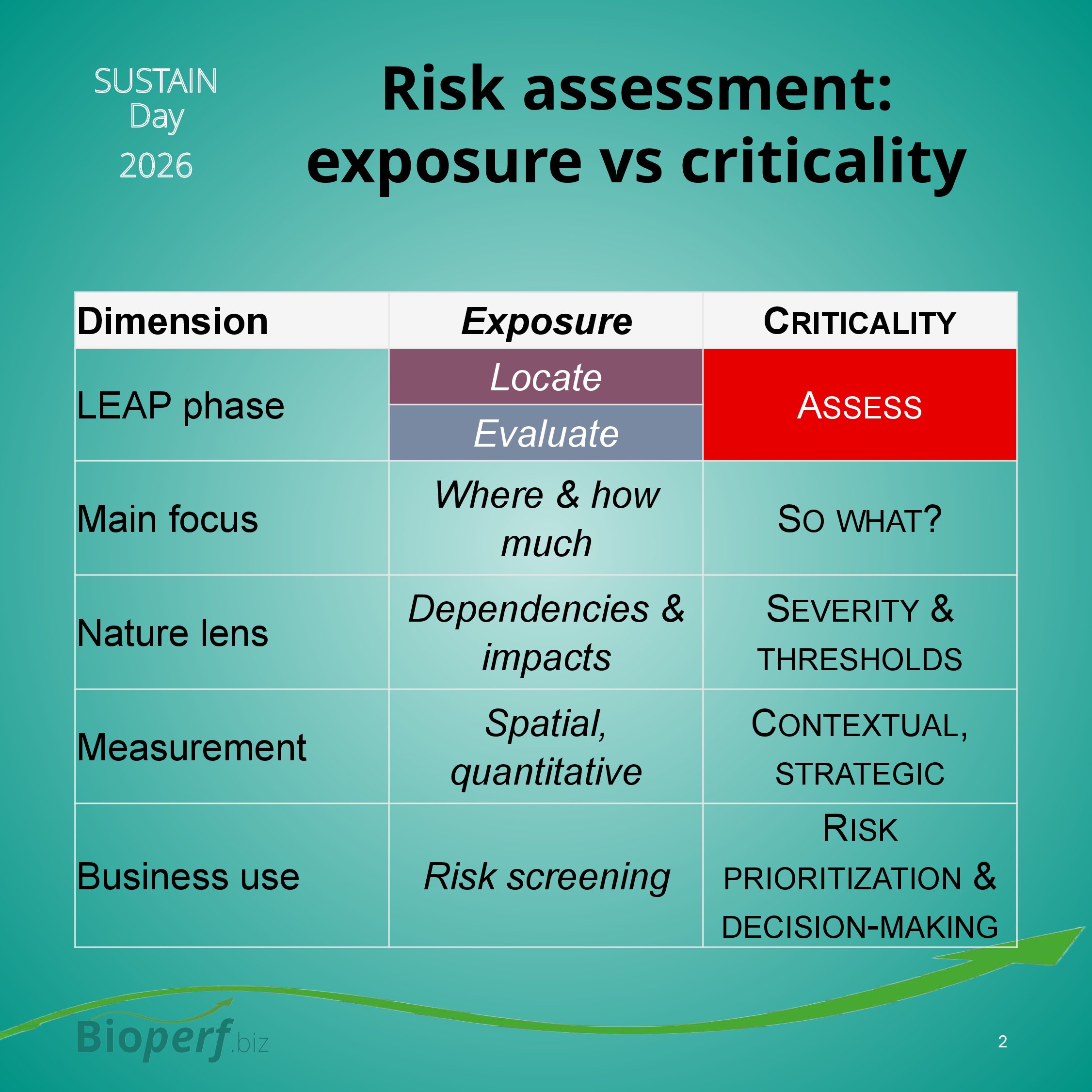 Moving from identifying risk exposure to evaluating which nature-related risks are most critical for companies. I.e. to assess the severity and strategic importance of these risks for the company (see carousel). At that step, use financial data when it comes to board-level trade-offs, risk comparison, investment prioritisation.