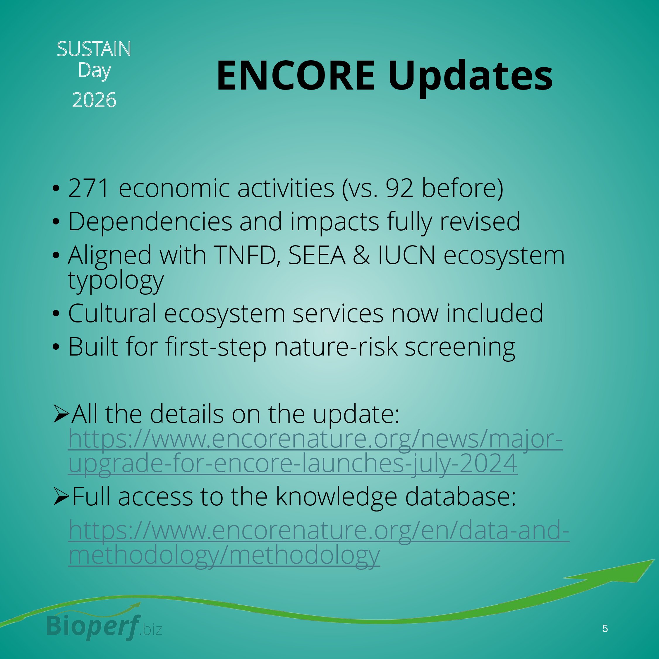 Highlights from ENCORE’s recent update include enhanced DI assessment, improved risk analysis, new mapping features, and better knowledge alignment with IUCN ecosystem typology. … (see carousel).